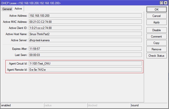 - Látható, hogy a Circuit ID helyén látható, hogy a „Test_ONU„-nak elnevezett ONU, 1-es portjáról és a 100-as vlan-ból érkezett az IP cím kérés. Természetesen az ONU nevét tetszőlegesen el lehet nevezni (pl. ügyfél név).