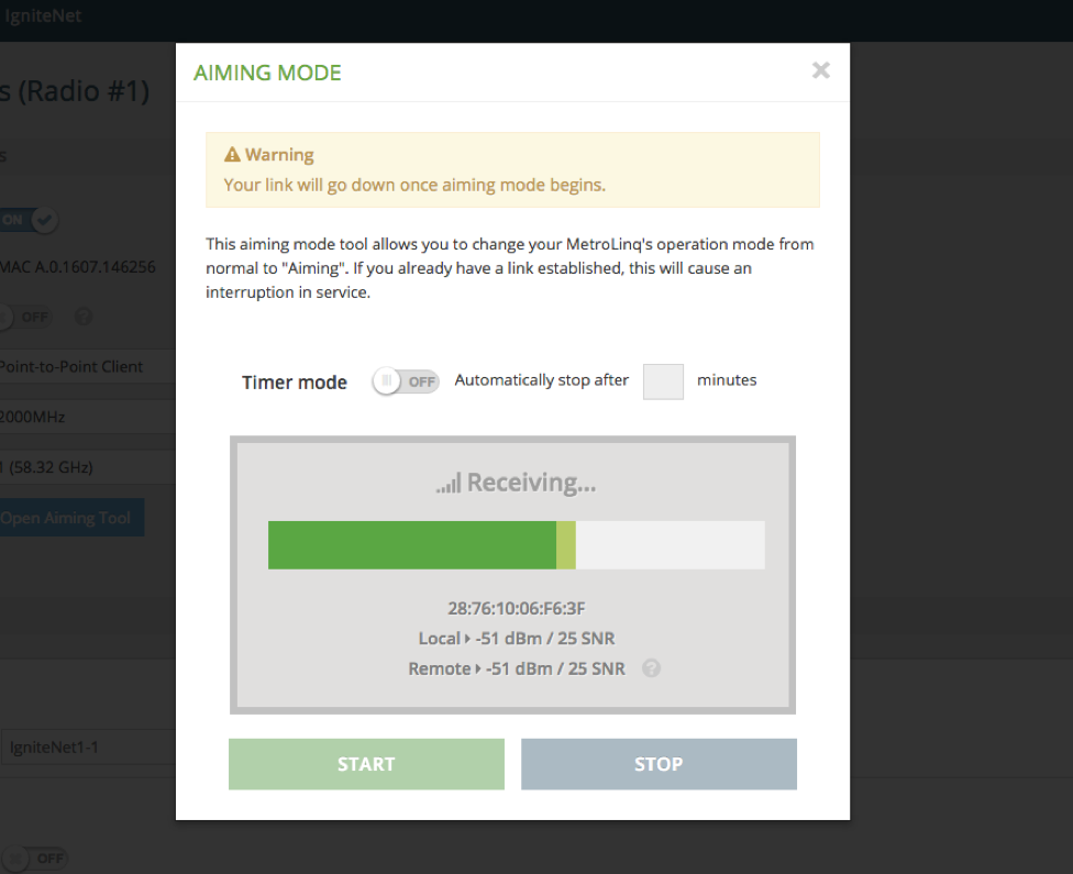 Miután megvagyunk a rádiók szemmel (és távcsővel) való beállításával, lehet klasszikus módon, kémény szélére helyezett laptoppal a csúszós nyeregtetőn egyensúlyozva nekilátni a finomhangolásnak (igaz történet alapján). A telefonunk ilyenkor a folyamatos értekezés miatt úgyis kezünk ügyében van, a telepítő kollégánkat felhívhatjuk, hogy a túloldalról kapcsolja a kliens rádiót Aiming Mode-ba, és állítson be egy nekünk szükséges időt a finomhangolásra:
